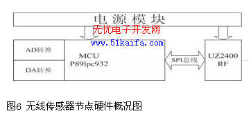 在測試中,我們使用三個無線傳感器節(jié)點來構(gòu)建對等網(wǎng)絡。其中,有一個節(jié)點通過串口和PC相連,作為網(wǎng)絡協(xié)調(diào)器,通過它可以將采集到的數(shù)據(jù)交給PC機。無線傳感器節(jié)點主要以Philips公司的p89lpc932單片機為核心,無線數(shù)據(jù)收發(fā)芯片采用Ubec公司的基于zigbee協(xié)議的UZ2400,節(jié)點硬件概況圖如下。通常情況下節(jié)點一般處于休眠狀態(tài),當有中斷請求時激活節(jié)點工作,接收數(shù)據(jù)。
