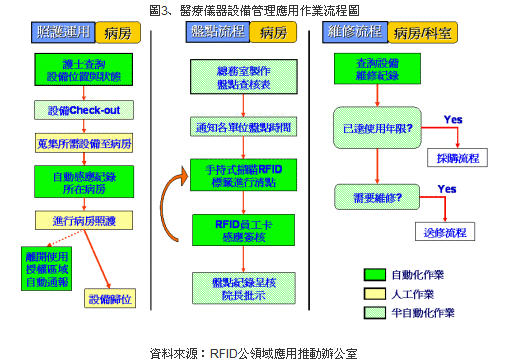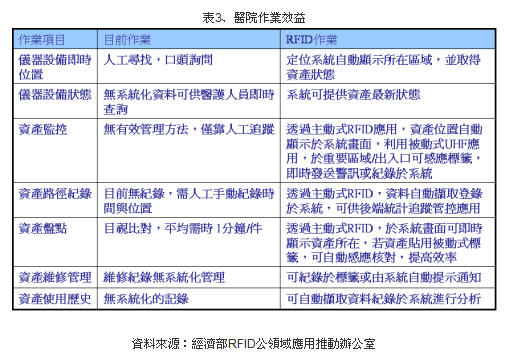 驗(yàn)證測(cè)試證實(shí)RFID技術(shù)在醫(yī)療儀器設(shè)備管理應(yīng)用的運(yùn)用流程具有管理效益。除整合了主動(dòng)式RFID與無(wú)線網(wǎng)路技術(shù),作為現(xiàn)階段解決方案之外,亦驗(yàn)證現(xiàn)有醫(yī)療儀器及設(shè)備可運(yùn)用一般物流用被動(dòng)式貼紙標(biāo)簽,可降低導(dǎo)入經(jīng)費(fèi)。透過(guò)RFID技術(shù)除簡(jiǎn)化人工與紙本紀(jì)錄處理模式,在照護(hù)過(guò)程中,亦可藉由即時(shí)發(fā)送警示,降低設(shè)備遺失機(jī)率;并強(qiáng)化臨床照護(hù)管理,提升作業(yè)效率。
