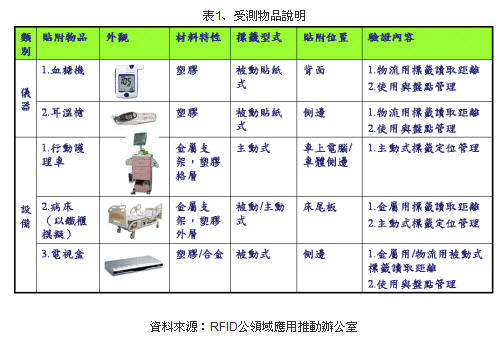 (1) 此次驗(yàn)證主要針對(duì)移動(dòng)式醫(yī)療儀器與設(shè)備,測(cè)試多款RFID產(chǎn)品的讀取率、厘清技術(shù)疑點(diǎn),并測(cè)試被動(dòng)式金屬標(biāo)簽讀取效果。