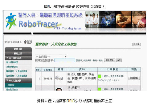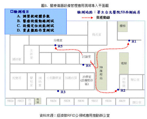 此次醫(yī)療儀器設(shè)備管理應(yīng)用概念驗(yàn)證在行政院衛(wèi)生署署立臺(tái)北醫(yī)院的積極配合下,與九家業(yè)者共同完成被動(dòng)式及主動(dòng)式RFID硬體的性能測(cè)試及資產(chǎn)辨識(shí)定位管理系統(tǒng)的雛形。署立臺(tái)北醫(yī)院為衛(wèi)生署所屬醫(yī)院北區(qū)區(qū)域聯(lián)盟管理委員會(huì)管理中心所在,執(zhí)行各項(xiàng)資源整合業(yè)務(wù)。醫(yī)院擁有近600張病床,年平均住院人次達(dá)12,000,是衛(wèi)生署所屬28家醫(yī)院之一。歷年來(lái)致力推動(dòng)醫(yī)療品質(zhì)與病人業(yè)務(wù)與國(guó)際接軌,其血液透析整合資訊系統(tǒng)于98年更獲得國(guó)際健康照護(hù)品質(zhì)協(xié)會(huì)(ISQua)之肯定,為國(guó)內(nèi)血液透析照護(hù)之典范。 98年于衛(wèi)生署“振興經(jīng)濟(jì)新方案-擴(kuò)大公共建設(shè)投資-‘加速辦理智慧醫(yī)療照護(hù)計(jì)劃’”下,與其他10家醫(yī)院進(jìn)行“醫(yī)院安全關(guān)懷RFID計(jì)劃”,而且是11家醫(yī)院中導(dǎo)入RFID應(yīng)用系統(tǒng)最完整的醫(yī)院,包含病患管理、用藥安全、貴重儀器管理、開刀房動(dòng)向管理等共十一個(gè)RFID子系統(tǒng)。
