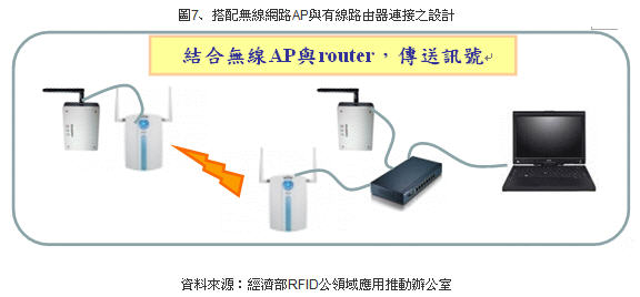 (5) 可搭配無(wú)線網(wǎng)路AP與有線路由器連接各讀取點(diǎn),接收標(biāo)簽訊號(hào),以延伸讀取范圍,涵蓋完整的管控區(qū)域(如下圖示)。