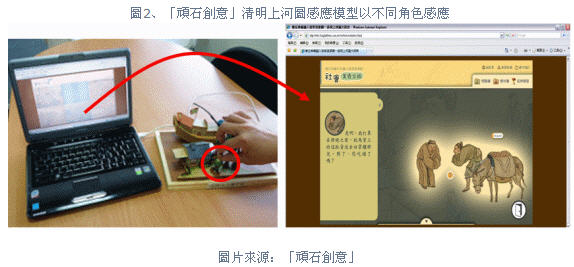 本次“頑石創(chuàng)意”與“資策會(huì)創(chuàng)研所”于IDEAS SHOW中合作展出的“清明上河圖互動(dòng)模型”即以“頑石創(chuàng)意”于2008年獲得日本“TBS DigiCon6+3 動(dòng)畫賞”佳作的“清明上河圖動(dòng)畫”與承接教育部計(jì)劃的“數(shù)位典藏融入教學(xué)資源網(wǎng)”(http://edu.brightideas.com.tw/)中的數(shù)位內(nèi)容為基礎(chǔ),透過RFID提供嶄新的互動(dòng)體驗(yàn)。