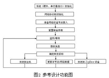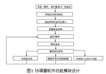 一個ZigBee只能有唯一的協(xié)調(diào)器,其主要功能是初始化及維護整個ZigBee網(wǎng)絡,其維護著所有直接連接的節(jié)點及未直接連接但允許加入網(wǎng)絡的節(jié)點的表,加入到此ZigBee網(wǎng)絡的設備必須得到協(xié)調(diào)器的批準協(xié)調(diào)器需要不間斷地監(jiān)聽其他節(jié)點加入或退出網(wǎng)絡請求及消息,在不發(fā)送消息時就需進入接收狀態(tài),因此協(xié)調(diào)器不能進入“睡眠”模式典型的協(xié)調(diào)器軟件功能模塊設計見圖3