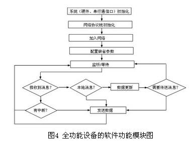 ZigBee網(wǎng)絡中的路由器為全功能設備,它完成各個全功能設備、簡化功能設備、協(xié)調(diào)器等節(jié)點間數(shù)據(jù)的路由,是構建網(wǎng)絡結構ZigBee網(wǎng)絡所必須的,同協(xié)調(diào)器一樣,全功能設備也維護著網(wǎng)絡中節(jié)點的相關信息表,且由于它必須連續(xù)不斷的監(jiān)聽路由消息,所以也不可進入“睡眠”模式全功能設備的軟件功能模塊設計見圖4