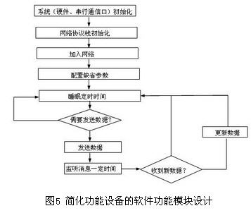 在簡化功能設備進入睡眠模式時,相鄰的協(xié)調(diào)器或路由器會緩存發(fā)送它的相關數(shù)據(jù)在退出睡眠模式時,它會向相鄰的協(xié)調(diào)器或路由器詢問是否有發(fā)送到它的數(shù)據(jù),相鄰的協(xié)調(diào)器或路由器則返回是否有其數(shù)據(jù)包的響應簡化功能設備在處理完發(fā)送到它的數(shù)據(jù)后,可重新進入睡眠模式簡化功能設備的軟件功能模塊設計見圖5