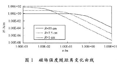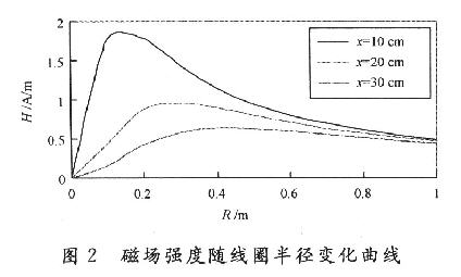 在與發(fā)射天線的距離x為常數(shù)并簡單地假定發(fā)射天線線圈中電流I不變的情況下,如果改變發(fā)送天線的半徑R時(shí),就可以根據(jù)距離x與天線半徑R之間的關(guān)系得到最大的磁場強(qiáng)度H。這意味著:對于每種射頻識別系統(tǒng)的閱讀器作用距離都對應(yīng)有一個(gè)最佳的天線半徑R。如果選擇的天線半徑過大,那么在與發(fā)射天線的距離x=0處,磁場強(qiáng)度是很小的;相反,如果天線半徑的選擇太小,那么其磁場強(qiáng)度則以z的三次方的比例衰減,如圖2所示。