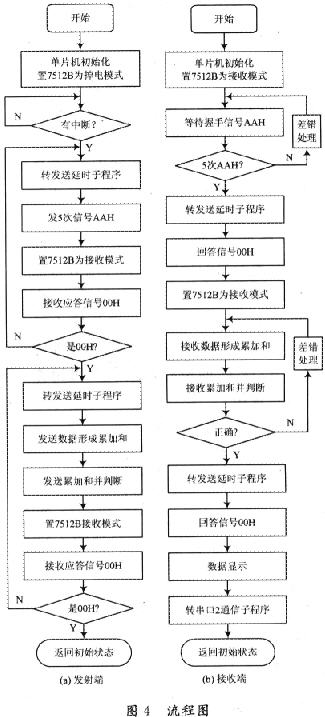 在系統(tǒng)的設(shè)計(jì)過程中,為了減少電臺(tái)靈敏度不高和信道質(zhì)量差誤碼等影響,發(fā)送方需連續(xù)發(fā)5次“握手”聯(lián)絡(luò)信號(hào),接收方在連續(xù)2次收到正確的聯(lián)絡(luò)信號(hào)以后,才確認(rèn)是有效的聯(lián)絡(luò)予以響應(yīng),否則認(rèn)為是干擾信號(hào),不予以響應(yīng)。這樣既能減少各類原因造成的接收機(jī)程序不啟動(dòng)運(yùn)行導(dǎo)致漏報(bào)的可能性,又能保證接收機(jī)不因干擾信號(hào)而誤操作,減少誤報(bào)的機(jī)率。另外綜合考慮電臺(tái)的收發(fā)轉(zhuǎn)換和調(diào)制解調(diào)芯片的收發(fā)轉(zhuǎn)化所需的各類延時(shí)時(shí)間,在設(shè)計(jì)程序時(shí)專門安排了一個(gè)延時(shí)時(shí)間。經(jīng)過大量的實(shí)驗(yàn),得出一個(gè)比較合適的延時(shí)時(shí)間,即不論通信哪一方,在由收轉(zhuǎn)為發(fā)狀態(tài)后,都先延時(shí)70 ms,因?yàn)闀r(shí)間太短了系統(tǒng)不能正常工作,太長(zhǎng)了可能會(huì)影響數(shù)據(jù)的傳輸速率,降低數(shù)據(jù)傳輸?shù)臅r(shí)性。系統(tǒng)數(shù)據(jù)發(fā)射端和接收端單片機(jī)程序流程圖如圖4所示。