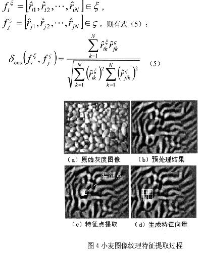 通過對糧食顆粒的灰度圖像進行紋理分析,獲得與結(jié)構相關的灰度分布的統(tǒng)計信息,可以實現(xiàn)對兩幅圖像的匹配分析,并作為判斷糧情變化的依據(jù)。對糧食顆粒灰度圖像的分析采用基于不變矩的圖像紋理的統(tǒng)計算法。該算法首先將原始圖像進行分塊,利用加窗傅立葉變換進行空域濾波增強,去除圖像在各個空間頻率處的噪聲,增強圖像中的紋理結(jié)構信息。然后選擇圖像中曲率最大的點進行特征提取,以提取的特征點為中心,對圖像進行局部的網(wǎng)格化處理,針對每個單元格計算其7個不變矩,對所有單元格各自的不變矩求和得到特征向量。同時借助最大類間方差閾值分割方法(OTSU),將圖中的單元格區(qū)分為前景和背景,并在求和時賦予不同的權重,可進一步提高圖像匹配的精度。小麥圖像紋理特征提取過程如圖4所示。最后利用特征空間中兩特征向量間的距離作為相似度衡量的標準。可采用余弦距離來表示。特征向量間余弦距離的定義為:設特征空間中兩特征向量分別為