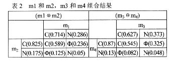 通過實際測量的數(shù)據(jù),經(jīng)過計算得到某一區(qū)域的四個虛擬傳感器信度值m1,m2,m3,m4如表l,用C表示可信度,N表示不可信度。