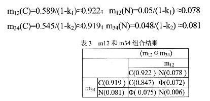 最后再對得到兩個基本信度m12和m34融合,基本信度分配(用m1234表示),見表3。