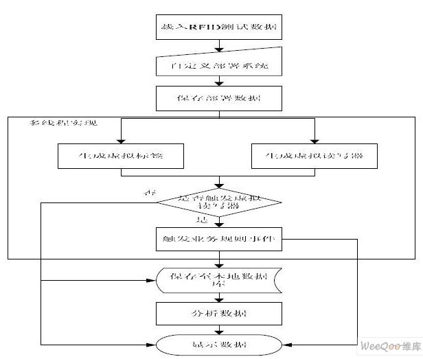 系統(tǒng)動(dòng)態(tài)仿真流程如圖 2 所示,仿真系統(tǒng)運(yùn)行之前首先載入RFID 測(cè)試數(shù)據(jù),用戶根據(jù)實(shí)際應(yīng)用需求自定義應(yīng)用部署系統(tǒng),系統(tǒng)自動(dòng)將各項(xiàng)配置轉(zhuǎn)化為具體參數(shù)并保存,供系統(tǒng)仿真運(yùn)行時(shí)調(diào)用。這里的運(yùn)行態(tài)基于事件驅(qū)動(dòng)設(shè)計(jì),利用多線程并行實(shí)現(xiàn),每個(gè)線程中仿真模擬一個(gè)或多個(gè)虛擬標(biāo)簽,若虛擬標(biāo)簽觸發(fā)虛擬讀寫器成功,則根據(jù)用戶自定義業(yè)務(wù)邏輯規(guī)則尋找對(duì)應(yīng)的標(biāo)簽事件,保存至本地?cái)?shù)據(jù)庫并實(shí)時(shí)顯示在系統(tǒng)界面中。當(dāng)所有線程的標(biāo)簽事件觸發(fā)完畢時(shí),仿真系統(tǒng)運(yùn)行結(jié)束,此時(shí)所有仿真運(yùn)行數(shù)據(jù)均保存在本地?cái)?shù)據(jù)庫中,部分?jǐn)?shù)據(jù)同時(shí)顯示在系統(tǒng)界面內(nèi)供用戶查詢。最后啟動(dòng)數(shù)據(jù)分析挖掘模塊,根據(jù)自定義統(tǒng)計(jì)規(guī)則和數(shù)據(jù)挖掘算法對(duì)本地?cái)?shù)據(jù)庫中的相關(guān)數(shù)據(jù)進(jìn)行整理歸納,統(tǒng)計(jì)仿真系統(tǒng)的靜態(tài)負(fù)載、動(dòng)態(tài)負(fù)載、流程瓶頸等指標(biāo),同時(shí)自動(dòng)生成相應(yīng)的咨詢建議供用戶參考[6],以文字和圖表的形式反饋至系統(tǒng)界面。