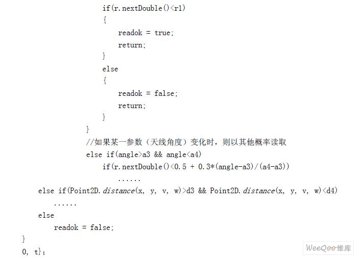 判斷虛擬標(biāo)簽是否觸發(fā)指定虛擬讀寫器是仿真系統(tǒng)運(yùn)行的關(guān)鍵環(huán)節(jié),觸發(fā)概率算法的準(zhǔn)確與否直接決定仿真結(jié)果的可信性,以下為虛擬標(biāo)簽的觸發(fā)概率算法: