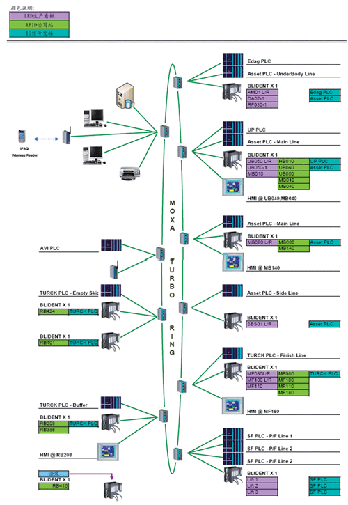 經(jīng)過(guò)RFID在江淮廠焊裝車(chē)間的實(shí)際應(yīng)用,我們發(fā)現(xiàn)采用基于管理型的工業(yè)以太網(wǎng)交換機(jī)建立Turbo Ring光纖環(huán)網(wǎng)的“集中監(jiān)控、分散控制”的方式是一種典型網(wǎng)絡(luò)控制模式,系統(tǒng)不僅實(shí)現(xiàn)了為車(chē)間內(nèi)的焊接設(shè)備(夾具、機(jī)器人等)和機(jī)運(yùn)系統(tǒng)提供車(chē)身基礎(chǔ)數(shù)據(jù)的最基本功能,還具有很多實(shí)用性優(yōu)點(diǎn):