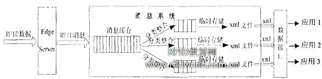 消息系統(tǒng)位于RFID中間件的中心層,如圖3所示。Edge Server產(chǎn)生事件,并將事件傳遞到消息系統(tǒng)中,由消息系統(tǒng)決定如何將事件數(shù)據(jù)傳遞到相應的應用系統(tǒng),處理過程描述如下:消息系統(tǒng)首先在f消息服務器上緩存來自Edge Server上的各種消息,然后依據(jù)消息內(nèi)容將這些消息分類整合,使得同類消息位于相同的消息隊列中,最后將分好類的消息分別存儲成相應的xml臨時文件,這些臨時xml文件最終會被送往數(shù)據(jù)接口做進一步的處理。