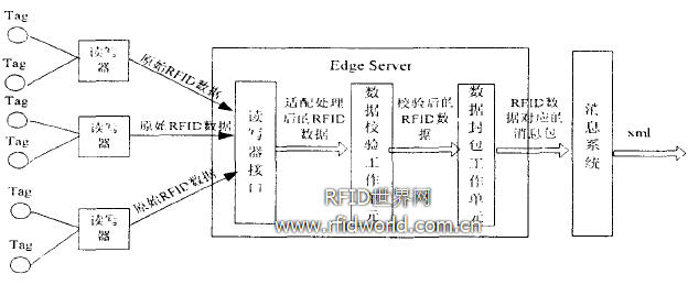 另外,UCLAWINMEC RFID實驗室所設計的RFID中間件是在分布式架構上構建的web服務,基于XML和SOAP,包含了簡單的捕獲、平滑、過濾、路由、聚合等功能;Bob WEB Violino構想性地給出了在企業(yè)內(nèi)部將web Services技術應用于RFID系統(tǒng)的例子,這個例子中指出零售部門可以在所到物品的信息與供應部門使用RFID技術所核算的內(nèi)容不一致的情況下,通過Web Services接口詢問供應部門并進行核對;臺灣資策會研究所提出了基于SOA思想的RFID中間件分層架構,并將其基礎架構層分為Edge Server和數(shù)據(jù)操作軟件兩層。