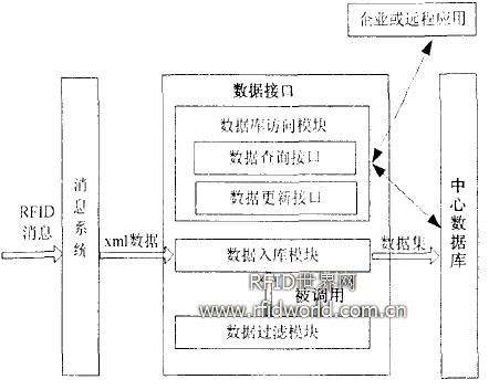 數(shù)據(jù)接口的結構圖如圖4所示。數(shù)據(jù)入庫模塊首先通過調(diào)用數(shù)據(jù)過濾模塊,將重復的RFID相關數(shù)據(jù)過濾掉,然后將過濾后的RFID相關數(shù)據(jù)移植到中心數(shù)據(jù)庫中。同時,數(shù)據(jù)接口中的數(shù)據(jù)訪問模塊提供了訪問中心數(shù)據(jù)庫的接口:數(shù)據(jù)查詢和數(shù)據(jù)更新接口,為企業(yè)應用乃至遠程應用程序提供服務。