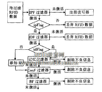 a)通過(guò)IPF過(guò)濾器,如果IPF過(guò)濾器未被激活,表示此讀寫(xiě)器未注冊(cè),即在黑/白名單中都不存在;如果IPF過(guò)濾器被激活,則根據(jù)ipFlag標(biāo)志決定其后的處理方法。若ipFlag為假,則表明該閱讀器處于黑名單過(guò)濾器中,過(guò)濾器被屏蔽,此待過(guò)濾RFID數(shù)據(jù)被丟棄;若ipFlag為真,系統(tǒng)將試圖激活I(lǐng)DF過(guò)濾器。