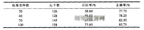 表1說(shuō)明,隨著病毒樣本庫(kù)中病毒變種數(shù)目的增加,即記憶過(guò)濾器集的進(jìn)化,RFID數(shù)據(jù)過(guò)濾模型的召回率和正確率在隨之提高,從根本上說(shuō)明了該模型的進(jìn)化能力。