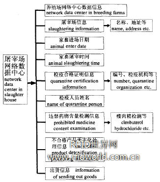 (3)肉類加工廠網(wǎng)絡(luò)數(shù)據(jù)中心該部分主要是在養(yǎng)殖場和屠宰場網(wǎng)絡(luò)數(shù)據(jù)的基礎(chǔ)上,增加加工廠信息、進(jìn)出加工廠時間和產(chǎn)品保質(zhì)期等相關(guān)信息即可。