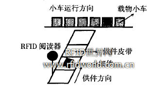 利用RFID方式在供件階段對郵件進行信息識別,在每臺供件臺的郵件整理端設(shè)置一臺RFID閱讀器,采用單一讀寫方式,這樣在供件過程中,郵件從皮帶機經(jīng)過閱讀器的時候,閱讀器識別電子標簽號碼,然后檢索分揀系統(tǒng)數(shù)據(jù)庫,獲得郵件的目的滑槽號碼,并為郵件分配運載小車。在此階段如果郵件信息無法識讀,則控制系統(tǒng)可發(fā)布提示信息并禁止此郵件進入分揀系統(tǒng)。這樣可防止信息缺損郵件占用載物小車導致的分揀效率降低,還可減輕工人的勞動強度。圖2是供件臺處RFID閱讀器的安裝位置示意圖。實際的系統(tǒng)每一臺供件機配置一臺閱讀器,采用低頻近距離射頻系統(tǒng),閱讀器采用近距離讀寫模式,防止設(shè)備對鄰近供件臺上的郵件信息的誤讀。在供件系統(tǒng)上應(yīng)用的射頻識別系統(tǒng),讀寫距離最好在1米的范圍之內(nèi),因為高效供件時,兩個相鄰郵件的距離一般小于80cm。另外相鄰供件臺之間的距離也在150cm的范圍之內(nèi)甚至更短。另外RFID閱讀器必須采取防干擾措施,防止對相鄰郵件或相鄰供件臺郵件信息的誤讀同。