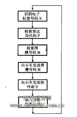 分揀過程信息處理過程為:識讀器讀取郵件電子標簽號碼N,檢索分揀數(shù)據(jù)庫中的標簽號碼為N的信息記錄,獲取郵件的寄達局代碼P,然后檢索控制數(shù)據(jù)庫中寄達局代碼為P的分揀機滑槽號碼M。郵件被輸送到C號小車后,通訊系統(tǒng)向C號小車發(fā)送卸件到M號滑槽的命令。C號小車到達M號滑槽后卸下郵件,同時系統(tǒng)向分揀結(jié)果表中插入郵件分揀結(jié)果記錄。圖3說明了分揀過程信息處理的流程。