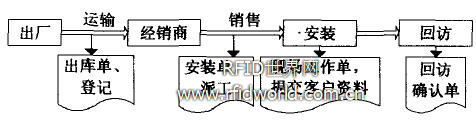 銷(xiāo)售工作流程如圖2所示。在圖2中.銷(xiāo)售管理過(guò)程中.產(chǎn)品出庫(kù)需要掃描電子標(biāo)簽.登記產(chǎn)品出廠情況:在經(jīng)銷(xiāo)商處.經(jīng)銷(xiāo)商可連上互聯(lián)網(wǎng)登記產(chǎn)品到貨情況:在產(chǎn)品出售后,提交安裝單。由經(jīng)銷(xiāo)商派工,安裝人員到現(xiàn)場(chǎng)安裝后,用手機(jī)與讀卡器掃描產(chǎn)品RFID。錄入相關(guān)安裝與客戶(hù)信息傳送提交到本部服務(wù)器。客服人員在收到安裝人員提交信息(在系統(tǒng)中自動(dòng)形成)后,應(yīng)適時(shí)進(jìn)行客戶(hù)回訪(電話),登記回訪情況。至此,銷(xiāo)售完成。