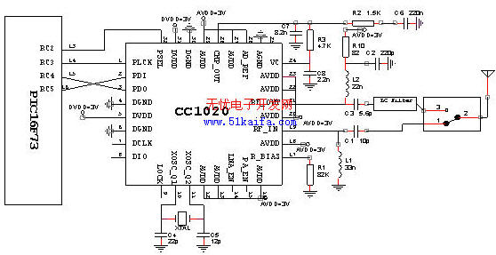 CC1020有32個(gè)引腳,它通過(guò)PDI、PDO、PCLK和PSEL這四個(gè)引腳與PIC16F73單片機(jī)的I/O端口相連,CC1020的應(yīng)用原理圖如圖2所示。