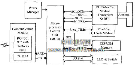 (1)射頻識(shí)別模塊,Transceiver IC$6700負(fù)責(zé)閱讀器與應(yīng)答器的通信,射頻讀寫模塊與MCU的通信基于$6700提供給MCU的串行數(shù)字通信接口實(shí)現(xiàn),包括SCLOCK,DIN,DOUT和M—ERR,分別代表時(shí)鐘線、數(shù)據(jù)輸入線、數(shù)據(jù)輸出線和錯(cuò)誤控制。