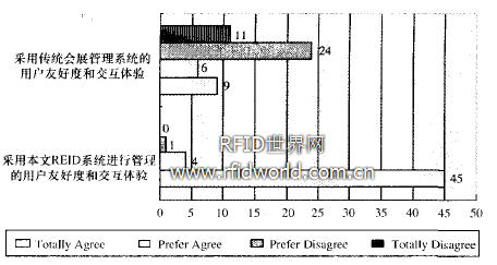 本文以會(huì)展為應(yīng)用實(shí)例,為了同時(shí)給參展商和與會(huì)人員提供便利,在某論壇暨展覽會(huì)中,采用本文RFID系統(tǒng)代替?zhèn)鹘y(tǒng)使用紙張出入證或條形碼的會(huì)展管理系統(tǒng)。系統(tǒng)由服務(wù)中心、展臺(tái)子系統(tǒng),移動(dòng)終端子系統(tǒng)3個(gè)部分組成,整個(gè)會(huì)展區(qū)域被看作一個(gè)上下文感知計(jì)算環(huán)境,本文關(guān)注的上下文信息包括參觀者的身份、位置、年齡、職業(yè)及參展商能提供的服務(wù)內(nèi)容等。會(huì)展前向每位參觀者和參展商發(fā)放一張智能標(biāo)簽作為出入證,標(biāo)簽的UID號(hào)唯一標(biāo)識(shí)該與會(huì)人員的信息。每個(gè)展臺(tái)部署有一個(gè)BTEnableReader節(jié)點(diǎn),參展商將其標(biāo)簽置于自己的展臺(tái)節(jié)點(diǎn)讀寫范圍內(nèi)。參觀者經(jīng)過(guò)該展臺(tái)時(shí),可以通過(guò)支持藍(lán)牙的移動(dòng)終端(如圖2所示的PDA,HPiPAQ5460,Pocket PC 2002)來(lái)控制BTEnableReader讀取參展商的標(biāo)簽,從而獲取參展商的介紹并了解該展商所能提供的服務(wù)。該上下文信息可以表現(xiàn)為一個(gè)存儲(chǔ)在參展商標(biāo)簽內(nèi)的URL,參觀者在終端上可以通過(guò)互聯(lián)網(wǎng)快速訪問(wèn)它。筆者在實(shí)驗(yàn)中調(diào)查了50名不同用戶,如圖4所示,結(jié)果表明用戶的友好度和交互體驗(yàn)得到很大提升。
