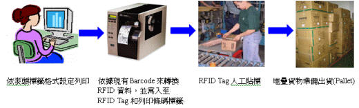由產(chǎn)品資料庫(kù)中依所要出貨的通知單號(hào)經(jīng)由標(biāo)簽列印管制系統(tǒng)自動(dòng)編號(hào)產(chǎn)生唯一RFID正/側(cè)麥頭標(biāo)簽,本計(jì)劃RFID印表機(jī)則是采用Zebra R110Xi,套用一般紙箱最常使用的4*6吋Alien 9540 Tag,由于RFID要取代原正/側(cè)麥頭標(biāo)簽,因此須在4*6吋Alien 9540 Tag中間再切一刀,原構(gòu)想只是請(qǐng)工廠加工切怎樣一刀不須花多少錢(qián),等廠商報(bào)價(jià)竟須花一筆上萬(wàn)不小的開(kāi)模費(fèi),要不是合作廠商鼎力到處拜托尋找,不然在數(shù)量不多情況下勢(shì)必得花一筆錢(qián)定制。圖2為標(biāo)簽列印與人工貼標(biāo)。