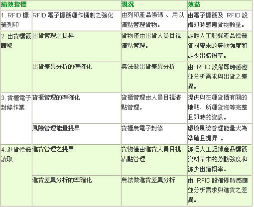 在完成RFID成品出貨管理及貨柜追蹤系統(tǒng)導(dǎo)入測(cè)評(píng)后與現(xiàn)有作業(yè)狀況作的績(jī)效指標(biāo)評(píng)估,如下表: