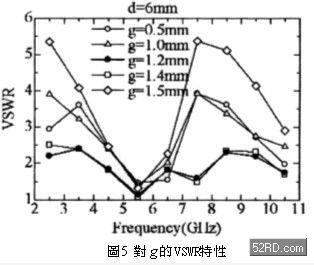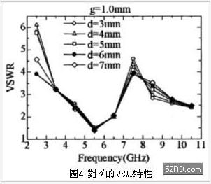 小型橢圓狀原件的高度則為0.16Wz,圖2中對(duì)阻抗整合特性最具影響的參數(shù)分別是兩橢圓狀原件的間隔「d」,與橢圓狀原件-倒U字型原件之間的間隙「g」,本天線的實(shí)際尺寸利用實(shí)驗(yàn)性檢討找出概略值,接著再透過模擬分析作最佳化設(shè)計(jì)。