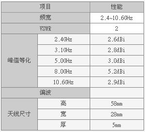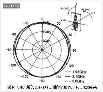 根據(jù)圖9的Elevation面的放射Pattern顯示,本UWB天線可以獲得接近8字形的指向性,而且圖8與圖9測試結(jié)果與圖6的計(jì)算結(jié)果非常一致;表1是本UWB天線特性一覽。