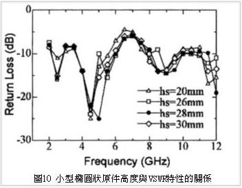天線電路基板化時(shí)選擇印刷電路板方式,由于本UWB天線上限頻率為11GHz,因此採用即使上限頻率損失仍然很低的鐵氟龍(Teflon)材質(zhì)基板,實(shí)際上基板厚暫定為0.8mm,比誘電率εr=2.6,接著利用Moment法以IE3D模擬軟體進(jìn)行尺寸最佳化設(shè)計(jì),圖10是針對(duì)小型橢圓狀原件高度hs進(jìn)行模擬分析獲得的VSWR特性,如圖10所示小型橢圓狀原件的高度28mm,頻率2GHz時(shí)VSWR最小,接著依此決定各部位最佳化尺寸。