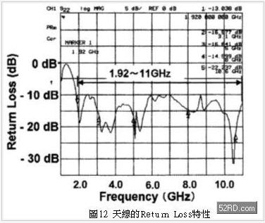 利用模擬分析獲得的參數(shù)制成的UWB天線,進(jìn)行實(shí)驗(yàn)性微調(diào)最才后將d設(shè)為5mm。圖7是UWB天線的Return Loss特性測試結(jié)果,如上所述美國聯(lián)邦通訊委員會(huì)( FCC)將UWB的頻寬定義為3.1~10.6GHz,根據(jù)測試結(jié)果顯示本天線在2.4~12GHz頻率范圍內(nèi)具有良好的放射Pattern,此時(shí)Return Loss低于9.5dB,VSWR則低于2.0dB。