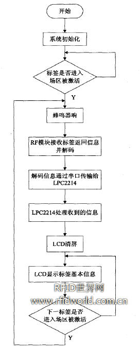 采用μ CLinux作為本系統(tǒng)的操作系統(tǒng)內(nèi)核。軟件的設(shè)計(jì)按照系統(tǒng)的基本運(yùn)行流程進(jìn)行,采用C語(yǔ)言編程。首先,系統(tǒng)供電初始化開(kāi)始,等待判斷是否有標(biāo)簽進(jìn)入有效閱讀區(qū)域;若無(wú),繼續(xù)等待并判斷直到檢測(cè)出區(qū)域內(nèi)出現(xiàn)標(biāo)簽,電磁波反射帶回標(biāo)簽信息;然后,進(jìn)行一系列的響應(yīng)和處理,完成識(shí)別過(guò)程。系統(tǒng)程序流程如圖2所示。