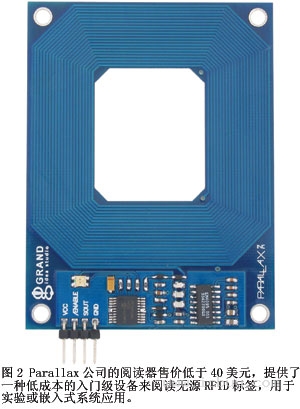 多數(shù)嵌入式RFID應(yīng)用都需要一種專用閱讀器作為設(shè)計(jì)的一部分,以便解釋本地標(biāo)簽。自動(dòng)售貨機(jī)很好地說明了嵌入式RFID應(yīng)用。這種機(jī)器能借助內(nèi)置閱讀器來接受RFID卡的非接觸支付。另外,如果發(fā)售的物品有標(biāo)簽,則機(jī)器還能了解其庫存,以便自動(dòng)訂購補(bǔ)貨。小型低成本嵌入式閱讀器對(duì)于這些應(yīng)用很關(guān)鍵,TI、SkyeTek、Parallax等公司供應(yīng)此類閱讀器。例如,Parallax公司與Grand Idea Studio公司合作開發(fā)的一種低成本RFID閱讀器模塊在無源轉(zhuǎn)發(fā)器標(biāo)簽中工作,用于門禁、自動(dòng)識(shí)別、機(jī)器人、導(dǎo)航、庫存跟蹤、支付系統(tǒng)、轎車發(fā)動(dòng)機(jī)防盜鎖等應(yīng)用 (圖2)。該模塊具有2400bps串口,并需要5V直流電源。Parallax閱讀器起價(jià)低于40美元。