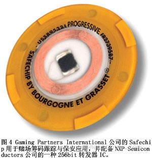 嵌入式RFID技術(shù)還非常適合于快速桌面賭博,其中的作弊和手法是難以檢測的。借助適當(dāng)?shù)臄?shù)據(jù)記錄工具,賭場經(jīng)營者就能監(jiān)視參賭者的行動(dòng),以便檢測撲克牌的計(jì)數(shù),調(diào)整獎(jiǎng)勵(lì),并盡量減少發(fā)牌者的錯(cuò)誤。例如,International Game Technology公司和Progressive Gaming International公司聯(lián)合開發(fā)了Table iD桌面賭博自動(dòng)化系統(tǒng),它結(jié)合了一個(gè)基于軟件的桌面管理器和一系列RFID芯片掃描模塊。最新的RFID賭博芯片工作于13.56 MHz,存儲(chǔ)容量超過10 kbit。在賭博期間,每個(gè)位置的芯片閱讀器識(shí)別并記錄每個(gè)參賭者的賭注。Table iD系統(tǒng)計(jì)算參賭者的下注模式,總結(jié)發(fā)牌者的活動(dòng),并且每小時(shí)記錄一次參賭者所做的決定。該系統(tǒng)無需用戶干預(yù)就能自動(dòng)更新平均賭注和輸贏記錄等信息。有幾家供應(yīng)商在制造適合于賭桌自動(dòng)化并基于RFID的賭幣。例如,Gaming Partners International公司在生產(chǎn)Safechip by Bourgogne et Grasset(圖4)。