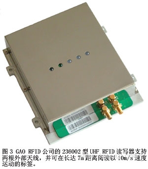 對(duì)于更耐久的應(yīng)用或工業(yè)應(yīng)用,GAO RFID公司提供一種UHF RFID讀寫器,它支持兩根外部天線(圖3)。236002型工作于902MHz~928MHz頻帶,面向高速倉儲(chǔ)、分銷、制造應(yīng)用。該模塊能在7m距離識(shí)別以10m/s速度運(yùn)動(dòng)的物體。該模塊需要12V直流電壓,并通過串行RS232或以太網(wǎng)接口通信。