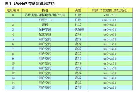 512位的EEPROM存儲空間,被分成16個扇區(qū)(編號為0-15),每個扇區(qū)有32位(編號為0-31),讀寫時按低位優(yōu)先的原則進(jìn)行,總是從LSB開始。其中第0和第1扇區(qū)由芯片生產(chǎn)廠商定義為只讀扇區(qū),芯片的類型、版本、用戶代碼和唯一序列號(UID)都寫在這兩個扇區(qū)中;第2,3,4三個扇區(qū)是內(nèi)部管理塊,用來定義器件的操作選項(輔助管理字段),它們由密碼塊、保護(hù)字塊和配置字塊組成;剩下的11個扇區(qū)(5-15)是用戶可以自由使用的空間(共352位)。EM4469的存儲器結(jié)構(gòu)如表1所示。