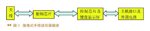 本系統(tǒng)的便攜式手持讀寫器體積小,攜帶方便,可以由管理人員帶到動物身邊讀寫耳標(biāo),主要由天線、射頻部分、控制部分以及主機(jī)接口四大模塊組成。此外,為了方便用戶使用,用來顯示和輸入數(shù)據(jù)的液晶顯示屏和鍵盤也是不可缺少的。設(shè)計原理框圖如圖3所示。各模塊功能介紹如下:
