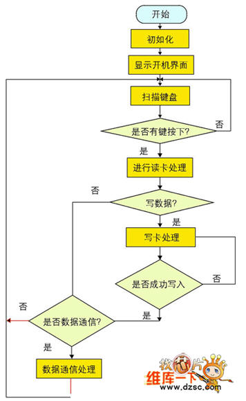 本系統(tǒng)的主要功能是完成便攜式手持讀寫器對電子射頻標(biāo)簽的讀寫過程。首先初始化單片機(jī)串口,發(fā)送開射頻場的命令,輸入要讀取(寫入)的數(shù)據(jù)扇區(qū)的區(qū)號。然后發(fā)送讀數(shù)據(jù)(寫數(shù)據(jù))的命令,判斷此命令是否發(fā)送完畢,若未發(fā)送完就繼續(xù)發(fā)送;若發(fā)送結(jié)束就判斷是否有數(shù)據(jù),沒有數(shù)據(jù)則提示錯誤并返回到初始化的地方,如果有數(shù)據(jù)就開始接收(寫入)。最后判斷接收到的數(shù)據(jù)正確與否,如果正確,則可以進(jìn)行數(shù)據(jù)處理;如果錯誤,則提示錯誤并返回初始化。