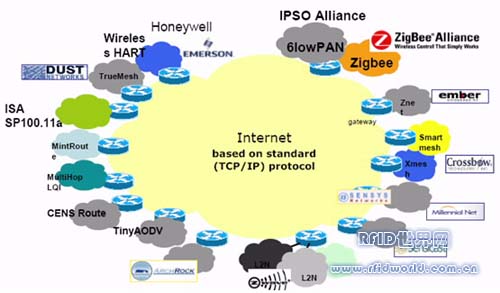 圖2是目前正在開發(fā)中的各種無線傳感器技術(shù),從這個(gè)圖我們可以看到,不同的無線傳感器網(wǎng)絡(luò),最終都是希望實(shí)現(xiàn)和互聯(lián)網(wǎng)的通訊,這可能是這些傳感器網(wǎng)絡(luò)最終交匯的通道。