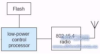 實(shí)現(xiàn)一個(gè)典型的無線傳感器網(wǎng)絡(luò)節(jié)點(diǎn)和路由器,可以采用多芯片方案,如圖3所示,由一個(gè)無線收發(fā)芯片和一個(gè)微控制器(單片機(jī))組成,微處理器可以采用低功耗的MSP430,無線芯片可以采用CC2520/CC2420等。