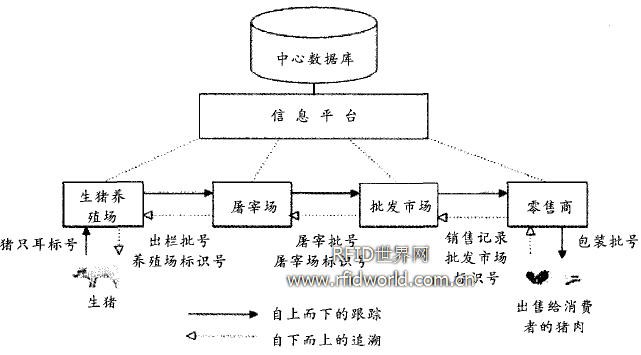 在農(nóng)產(chǎn)品追溯體系中,對(duì)農(nóng)產(chǎn)品以及供應(yīng)鏈上各參與方的信息進(jìn)行有效的標(biāo)識(shí)和收集是基礎(chǔ),也是難點(diǎn)所在。因?yàn)閷?shí)現(xiàn)跟蹤與追溯需要在供應(yīng)鏈上的各個(gè)環(huán)節(jié)實(shí)現(xiàn)無(wú)縫鏈接,斷鏈的信息是無(wú)法滿(mǎn)足跟蹤與追溯的要求。使用 RFID 技術(shù)結(jié)合網(wǎng)絡(luò)、信息系統(tǒng)進(jìn)行數(shù)據(jù)的采集和通信,其目的在于提高信息的采集、傳遞的效率,對(duì)農(nóng)產(chǎn)品有效地進(jìn)行標(biāo)識(shí),把分散的信息集成起來(lái),從而達(dá)到追溯的要求。下面將以商品豬肉供應(yīng)鏈為例,具體說(shuō)明 RFID 技術(shù)在農(nóng)產(chǎn)品追溯中的應(yīng)用為了實(shí)現(xiàn)全程的跟蹤和監(jiān)控,追溯體系需要在商品豬肉供應(yīng)鏈的各關(guān)鍵節(jié)點(diǎn)— — 生豬養(yǎng)殖場(chǎng)、市境道口、屠宰場(chǎng)、批發(fā)市場(chǎng)— — 設(shè)置控制點(diǎn),使用 RFID 標(biāo)簽記錄追溯所需的信息,如圖2所示。