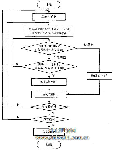 讀卡過(guò)程先對(duì)系統(tǒng)進(jìn)行初始化,單片機(jī)ATmega88的T/C1內(nèi)部有輸入捕獲單元,可應(yīng)用于精確捕獲一個(gè)外部事件的發(fā)生以及事件發(fā)生的時(shí)間印記。EM4095解調(diào)輸出的波形輸入到單片機(jī)的ICP1引腳,單片機(jī)進(jìn)行跳變沿捕獲,定時(shí)器捕捉中斷的觸發(fā)方式必須采用上升沿和下降沿交替進(jìn)行。也就是說(shuō),在下降沿捕捉中斷處理程序中設(shè)置下次捕捉中斷的觸發(fā)方式為上升沿,在上升沿捕捉中斷處理程序中設(shè)置下次捕捉中斷的觸發(fā)方式為下降沿。算出兩次跳變的時(shí)間間隔,根據(jù)時(shí)間間隔是否在一定的容差范圍內(nèi)判斷是半位周期還是位周期,判定碼元的“0”,“1”值。解碼之后去掉用來(lái)防止數(shù)據(jù)頭重復(fù)出現(xiàn)的尾碼,數(shù)據(jù)保存后查找ll位的數(shù)據(jù)頭,找到數(shù)據(jù)頭后對(duì)對(duì)64位ID號(hào)進(jìn)行CRC校驗(yàn),校驗(yàn)通過(guò)后便可獲得動(dòng)物標(biāo)簽ID號(hào)。4 結(jié)語(yǔ)