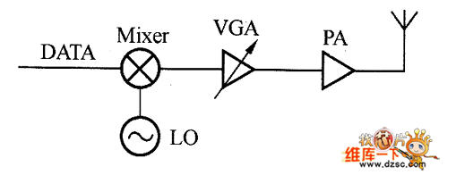 圖1是用于幅度調(diào)制的發(fā)射電路架構(gòu),包括本地振蕩(LO)、可變增益放大器(VGA)、功率放大器(PA)以及天線(Anta),其中LO提供了發(fā)射電路的載波頻率,輸入數(shù)據(jù)通過VGA來調(diào)制發(fā)射載波,從而產(chǎn)生幅度調(diào)制信號。PA則把輸出功率進行放大,然后通過天線把信號發(fā)送出去。這種發(fā)射電路的結(jié)構(gòu)比較簡單,采用的硬件比較少。