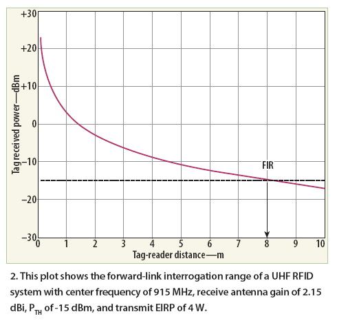 UHF RFID系統(tǒng)的性能通常由系統(tǒng)的詢(xún)問(wèn)范圍來(lái)表征,該范圍被定義為RFID閱讀機(jī)能夠識(shí)別標(biāo)簽的最大距離。詢(xún)問(wèn)范圍可分為兩大類(lèi):前向鏈路詢(xún)問(wèn)范圍(FIR)和反向鏈路詢(xún)問(wèn)范圍(RIR)。在UHF RFID系統(tǒng)中,前向鏈路指的是從閱讀機(jī)到標(biāo)簽的通信鏈路,而反向鏈路是指從標(biāo)簽到閱讀機(jī)的通信鏈路。FIR被定義為標(biāo)簽接收到可實(shí)現(xiàn)啟動(dòng)和后向散射的功率的最大距離,而RIR是閱讀機(jī)能夠解碼滿(mǎn)足SNR要求的標(biāo)簽數(shù)據(jù)的最遠(yuǎn)距離。由于實(shí)際的詢(xún)問(wèn)距離取決于FIR和RIR中的最小值,因此在部署UHF RFID系統(tǒng)時(shí)應(yīng)同時(shí)考慮這兩個(gè)值。