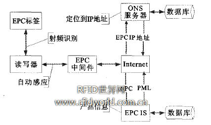 EPC工作流程:在由EPC標(biāo)簽、讀寫器、EPC中間件、Intemet、ONS服務(wù)器、EPC信息服務(wù)(EPC Is)以及眾多數(shù)據(jù)庫組成的實物互聯(lián)網(wǎng)中,讀寫器讀出的EPC只是一個信息參考,由這個信息參考從Intemet找到IP地址并獲取該地址中存放的相關(guān)的物品信息。由于在標(biāo)簽上只有一個EPC代碼,計算機需要知道與該EPC匹配的其它信息,這就需要ONS來提供一種自動化的網(wǎng)絡(luò)數(shù)據(jù)庫服務(wù),EPC中間件將EPC代碼傳給ONS,ONS指示EPC中間件到EPC信息服務(wù)器找到保存產(chǎn)品信息的文件并由EPC中間件復(fù)制,因此產(chǎn)品信息就能傳到供應(yīng)鏈上。EPC系統(tǒng)的工作流程如圖1所示: