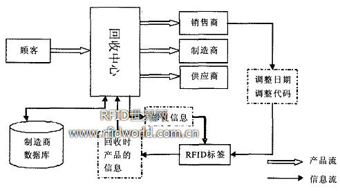 統(tǒng)網(wǎng)絡(luò)發(fā)送至制造商數(shù)據(jù)庫。當產(chǎn)品通過回收中心修復處理,再由銷售商二次銷售時,銷售商將調(diào)整產(chǎn)品RFID上的相關(guān)Et期及客戶代碼。同時向數(shù)據(jù)庫上傳信息。